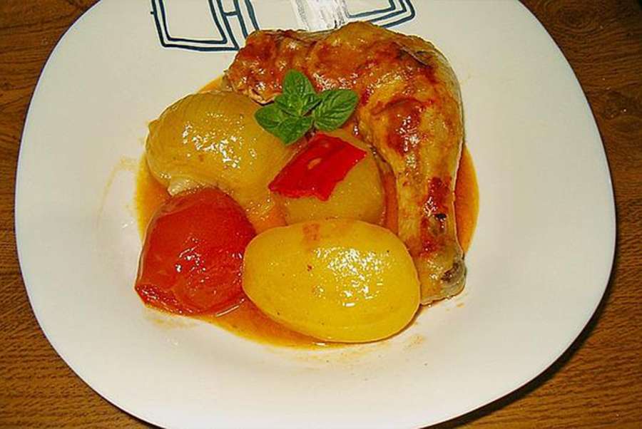 In einem großen Topf leicht anbraten. Zwiebeln, Kartoffeln und Tomaten unzerteilt, 2-4 Knoblauchzehen klein geschnitten dazu geben und mit Weißwein ablöschen, bis alles fast bedeckt ist. Etwas Thymian und einen Zweig Rosmarin dazu geben. Etwa 40 min. auf kleiner Flamme köcheln lassen. Wer möchte, kann die Soße etwas andicken.