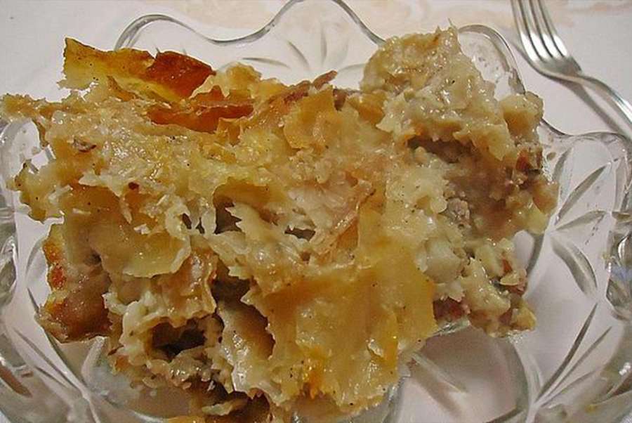 Nun die Hälfte des Blätterteiges in eine gefettete, feuerfeste Form geben, die Zutaten für die Füllung darauf verteilen und mit den restlichen Blätterteigstücken bedecken, so dass alles zusammen etwa 2- cm-hoch ist.