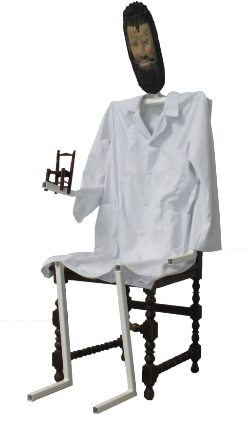 Bearded puppet with metal skeleton, clothing, wooden chair, wooden miniature chair