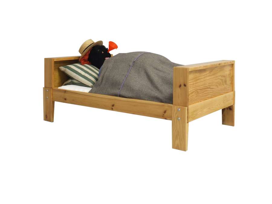 polystyrene puppet, straw hat, black balaclava, red wig, cotton shirt and bow tie, red plastic, funnel, woolen military blanket, mattress, two pillows with striped covers, wooden bed, speaker, iPod shuffle, charger, cable, sound